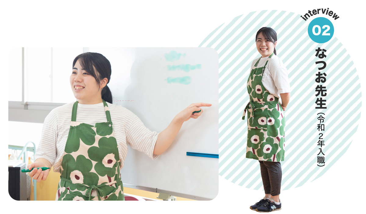 私は出産を機に一度園を離れ子育てをしていましたが、声をかけていただき復帰しました。仕事と子育ての両立に最初は不安もありましたが、職場の先生たちに助けていただきながら安心して働くことができました。また自分の子どもを自分の職場に預けられるので、その点もすごく恵まれています。