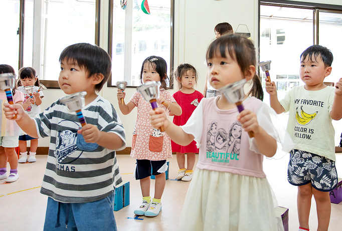 全学年を通じて音楽を楽しむ活動を大切に行っています。満3歳組はリズムを感じることや歌うことから始め、発達に合わせて年少組ではハンドベル、年中組ではミニキーボード、年長組になると和太鼓や鼓隊と、様々な楽器を使った音楽活動を体験します。